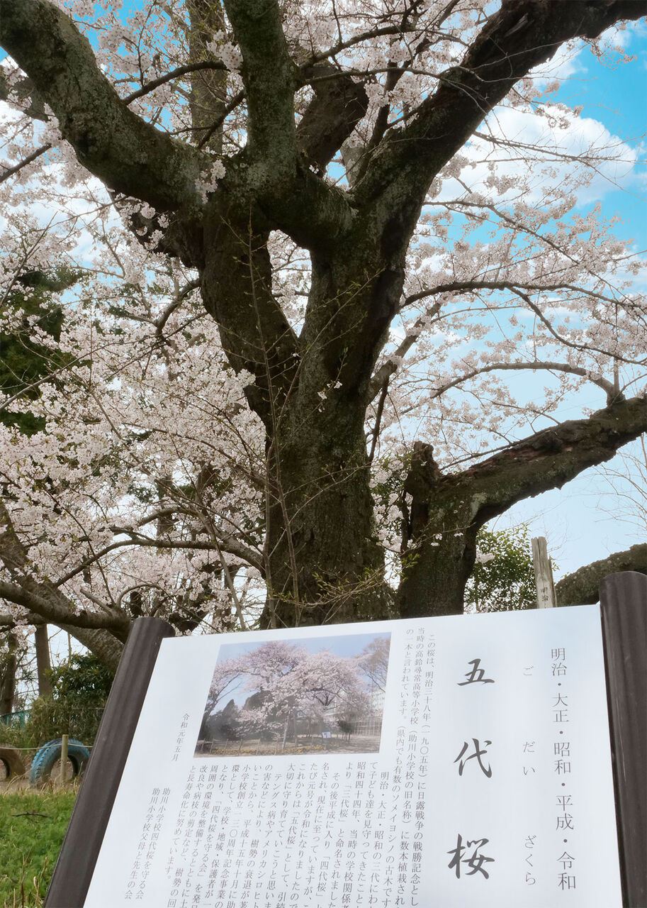 この桜は、明治38年(1905年)に日露戦争の戦勝記念として、当時の高鈴尋常小学校(助川小学校の旧名称)に数本植栽されたうちの一本と言われています。明治・大正・昭和の三代に渡って子どもたちを見守ってきたことから、昭和44年、当時の学校関係者により「三代桜」と命名されましたが、その後平成に入り「四代桜」と改名されました。昨年、令和の新たな時代を迎え「五代桜」と改めて命名されました。