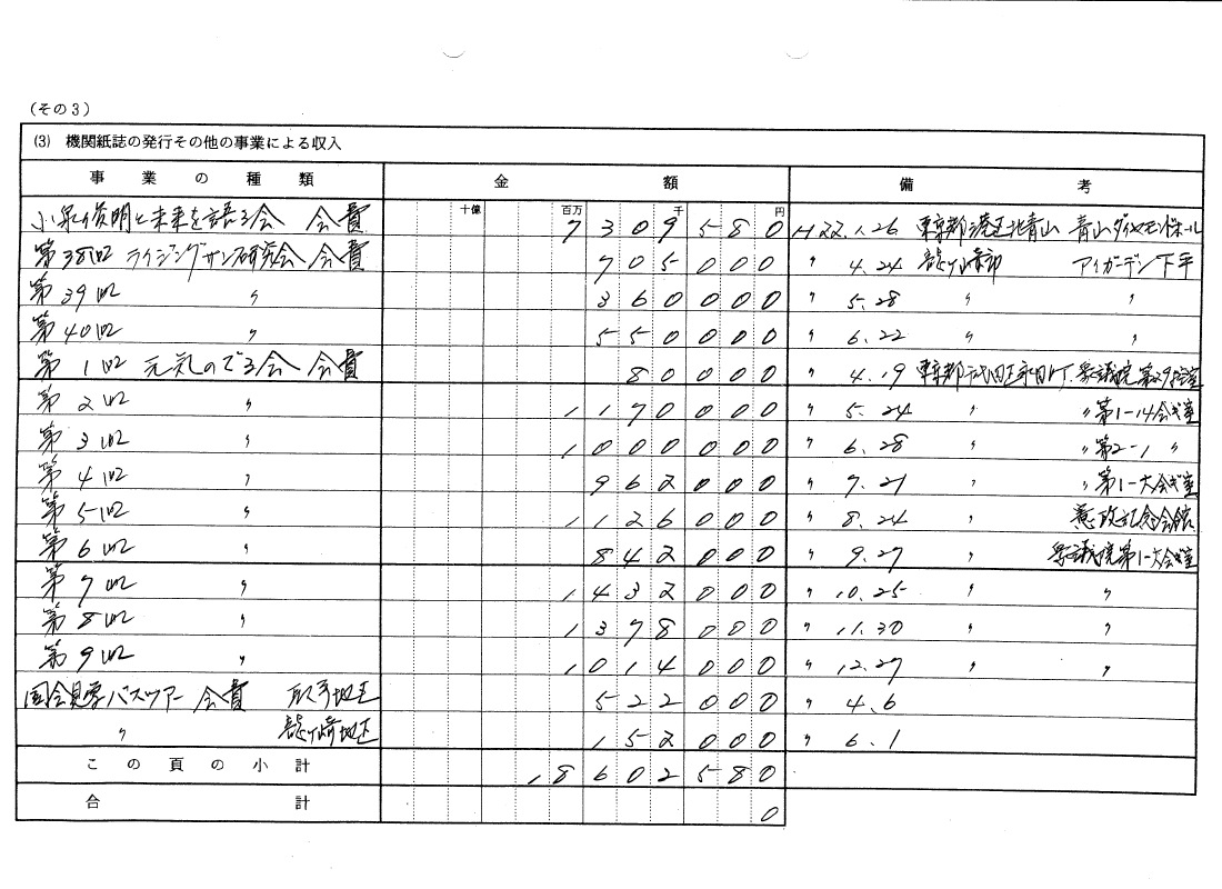 インターネットより取得した「いずみ会」の政治資金収支報告書によると、衆議院内の控室で「元気のでる会」との名称の政治資金パーティーを開催。それ以降、5月から12月の間には衆院第1、第2議員会館の会議室で7回にわたってパーティーを開催していました。8回で計約788万円の収入を得ていました。