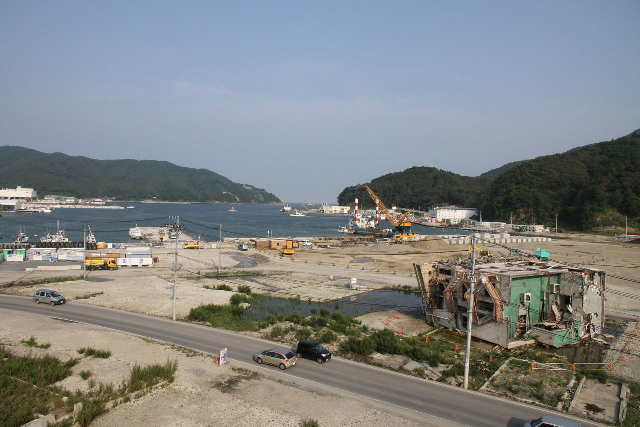 女川地域医療センターからの女川町の展望。女川町は20mもの津波によって、町内の住宅の7割が流失し、人口のおよそ1割の方が尊い生命を失うという未曽有の災害に見舞われました。市街地では、ほとんど建物の解体が終わり、嵩上げ工事が始まっています。
