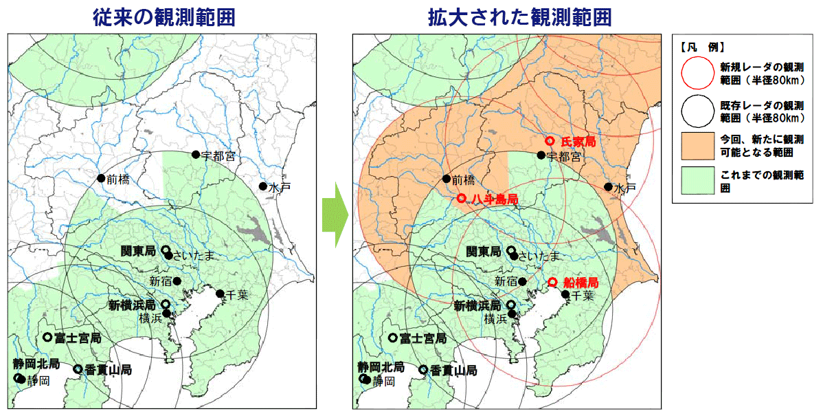 今回の8基増設で、関東地域の観測網が大幅に強化されました。従来、2基(関東局、新横浜新局)で観測を行っていましたが、新規(氏家局、八斗島局、船橋局)の配信開始により、観測範囲が拡大(千葉県、埼玉県、茨城県、群馬県等)するとともに、複数基で観測される範囲の観測精度が向上しました。