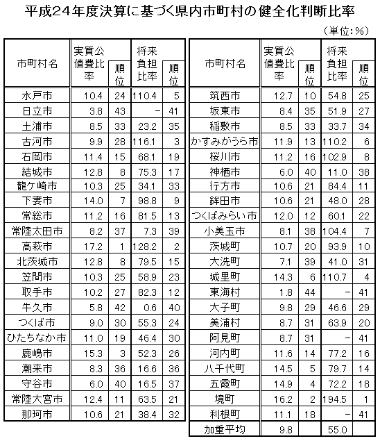 茨城県は、2012年度決算に基づく財政健全化判断比率をまとめ、10月3日に開会した県議会に報告しました。それによると、財政健全化法で義務づけられた4指標は、いずれも早期健全化判断基準未満で改善傾向を示しました。