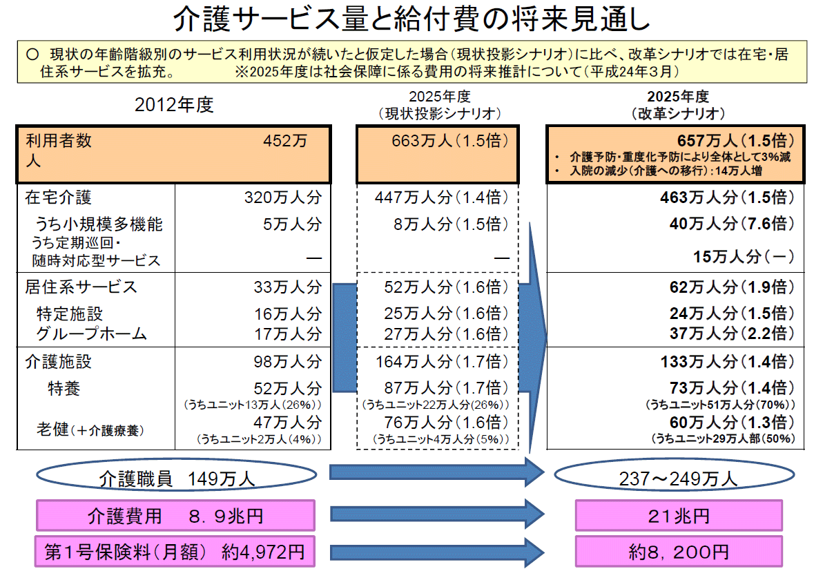 介護が必要な高齢者を社会全体で支える介護保険制度は、2000年からスタートしました。当初その総費用は3.6兆円ですが、利用者の拡大を受けて、2013年度には9.4兆円と、14年間で2.6倍に増えています。団塊世代が75歳に達する2025年には、様々な改革を行った上でも21兆円を超えると見込まれています。