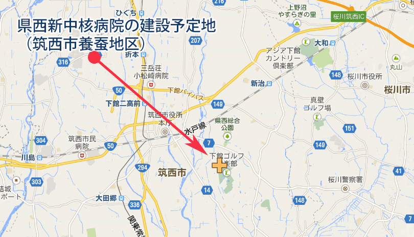 茨城県では、こうした現状から、2009年に「第1次地域医療再生計画」を策定し、新たな中核病院建設を盛り込みました。この第1次計画は国の医療再生基金から13億円の予算が割り当てられ、脳卒中や心筋梗塞などにも対応できる二次救急病院を総事業費45億円で建設する計画でした。一般病床は200床程度、常勤医師35〜40名程度とし、筑西市民病院は無床診療所、県西総合病院は120床程度のサテライト病院とすることになっていました。建設予定地は筑西市の竹島地区に一応決定しましたが、桜川市議会議が調査費予算を3回否決し、計画は頓挫しました。