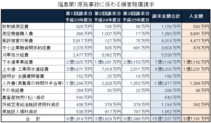 8月20日、東京電力福島第一原子力発電所の事故をめぐって、茨城県は平成25年度中に負った損害として総額3億2000万円余りを賠償するよう、東京電力に3回目の請求を行いました。茨城県が請求したのは、平成25年度中に原発事故によって余分にかかった行政経費など3億2000万円余りです。請求の主な内訳は、放射性物質が含まれる下水汚泥の処分費用などが2億6100万円余り、水道水に放射性物質が含まれていないか検査する費用などが2500万円余り、職員の時間外勤務手当など人件費が1300万円余りなどとなっています。