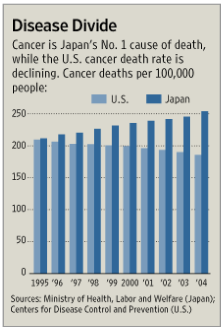 少し古い資料ですが、2007年7月11日付けの"ウォールストリート・ジャーナル"のオンライン版では、人口10万人当たりのがんによる死亡数が減少しているアメリカに比べて、日本では死亡原因のNo1であるがんによる死が増え続けているとの記事を掲載しました。