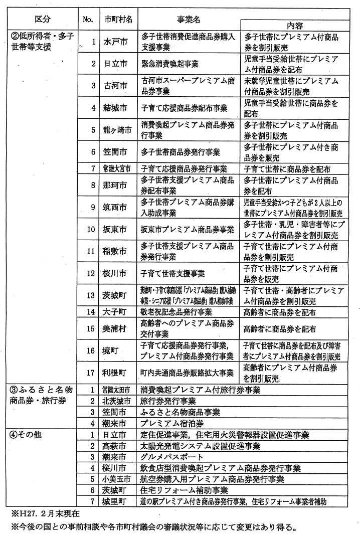 また、高齢者の支援として太子町、美浦村、茨城町、利根町では高齢者にプレシアム付き商品券を配布または割引販売します。
