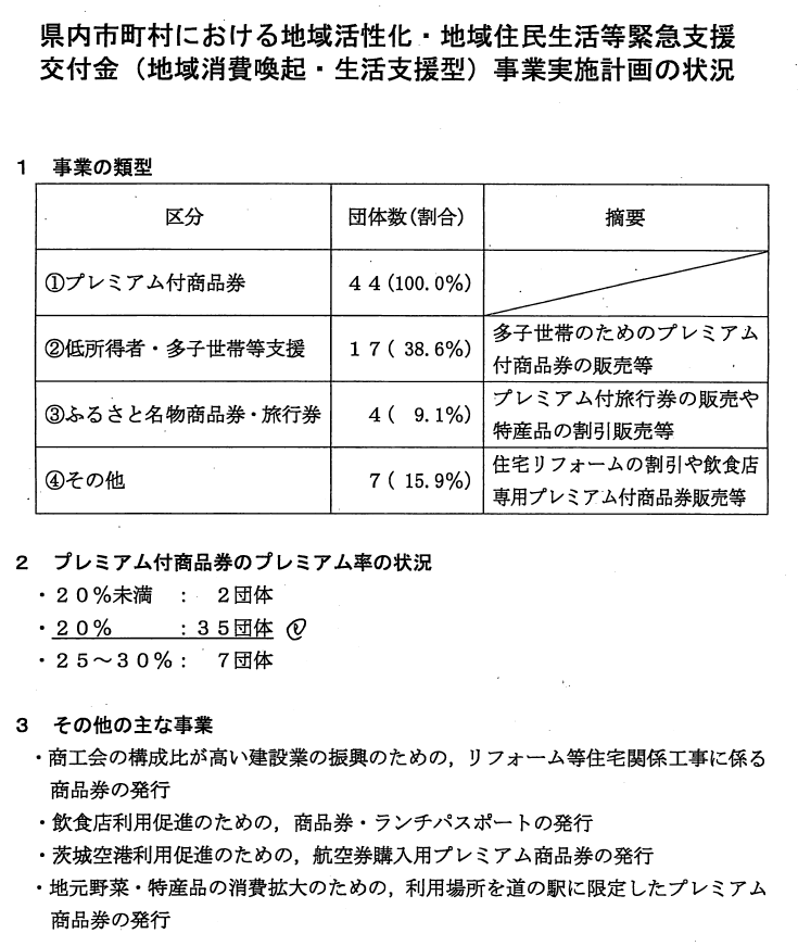 総務企画常任委員会での質疑と公明党の調査結果をもとに、茨城県内市町村の「プレミアム付き商品券」の発行計画をご紹介します。
