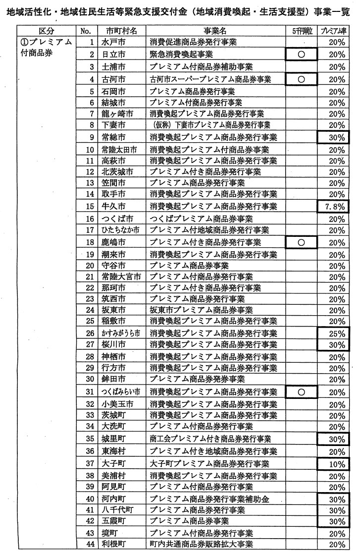 25〜30%のプレミアムを付けたのが、7市町村(30%:常総市、桜川市、城里町、河内町、八千代町、五霞町。25%かすみがうら市)、20%が水戸市、日立市など35市町村、大子町は10%、牛久市は7.8%としています。