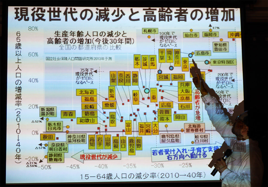 藻谷さんが示したのは、全国の都道府県を今後30年間の世代別人口増減率予測でプロットしたグラフです。縦軸は、65歳以上(高齢者)人口の増減率、横軸は15〜64歳人口(生産年齢人口)の増減率です。右上に行けば行くほど、高齢者人口も増えるが生産人口を増えます。