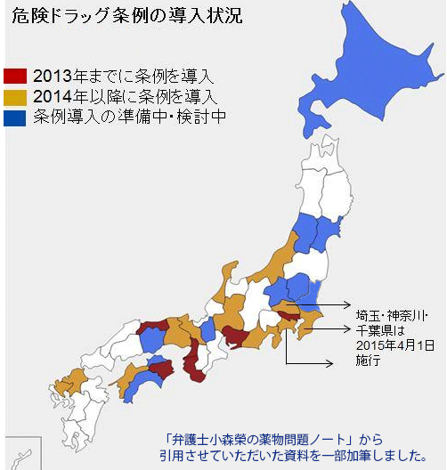 3月末までに、神奈川県、埼玉県、千葉県の県議会で審議されていた危険ドラッグ条例が相次いで可決され、4月1日から施行されています。これで、危険ドラッグに対する首都圏の包囲網が完成することになりました。栃木県、群馬県でも条例制定の動きがあります。茨城県議会では、議員提案で6月議会に条例を案を提出する準備が進んでします。