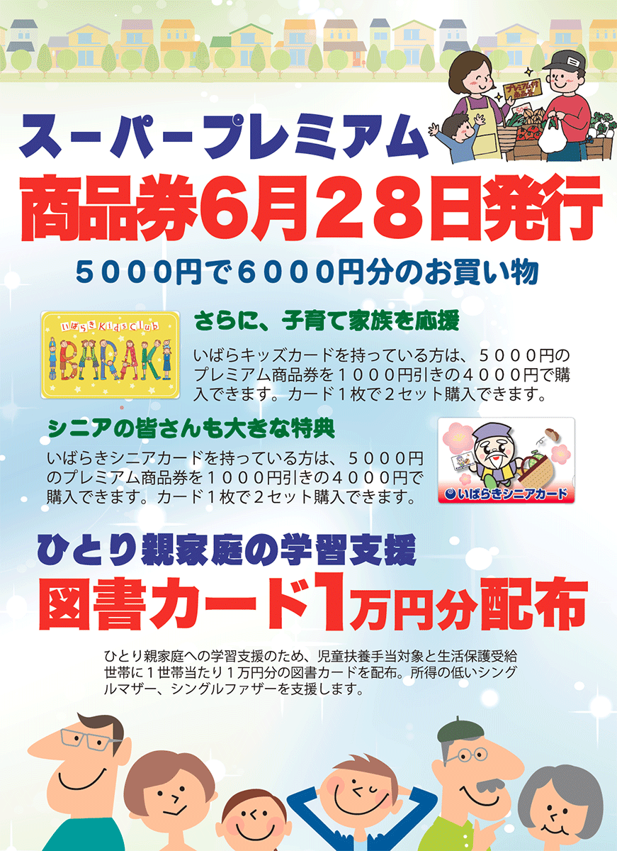 さらに、茨城県は日立市のスーパープレミアム商品券に上乗せする形で、子育て支援と高齢者の支援を行います。茨城県が発行している「いばらキッズカード」(18歳未満子どもがいる家庭に配布しているカード)と「いばらきシニアカード」(65歳以上の希望する高齢者に配布しているカード)を持参した人には、額面6000円のスーパープレミアム商品券を2セットまで、4000円で販売します。プレミアム率5割という大変お得な商品券となっています。