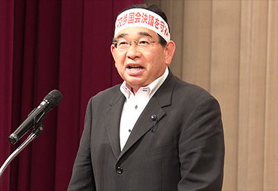 自民党茨城県連会長の梶山弘志衆議員議員は「今月28日から閣僚会合がハワイで開催される重大な局面にさしかかった。自民党としても政府に国会決議を守るよう改めて申し入れを行った。最終の結果において、評価をいただけるよう全力を挙げる」挨拶しました。