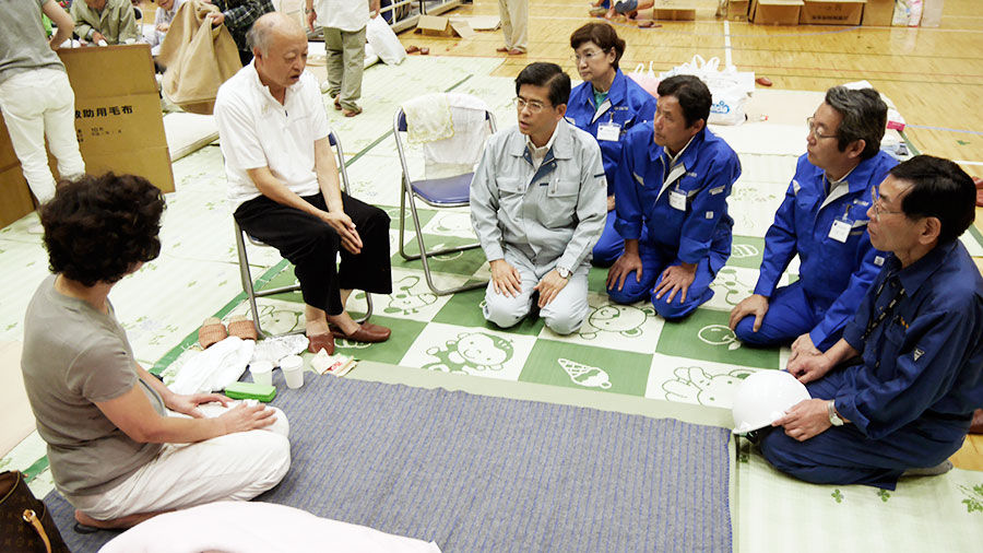 その後、一日は常総市立石下西中学校、石下総合体育館を訪れ、避難している方々から様々なご要望を伺いました。避難住民からは、「携帯電話、スマートフォンの充電器がなく、家族と連絡がとれない」「後片づけと暑さで体がベトベト。できれはお風呂に入りたい」「お年寄りが床にそのまま寝るのはかわいそうだ」などの声が寄せられました。