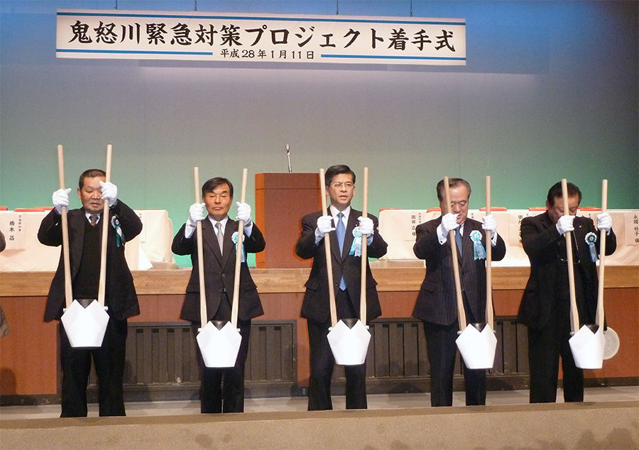 1月11日、「鬼怒川緊急対策プロジェクト」の着手式が、常総市新石下の地域交流センター(豊田城)で開かれました。