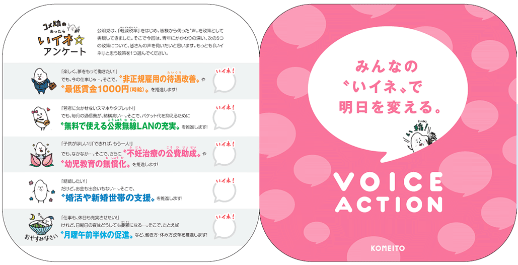 「VOICE ACTION」は、今夏の参院選から「18歳選挙権」が実施されることを踏まえ、18〜30歳代を対象に昨年秋に行った青年政治意識調査7000人超の声を基にしたものです。要望が強かったものから導き出した5つの代表的な青年政策案のうち、実現してもらいたい政策一つを選んでもらいます。
