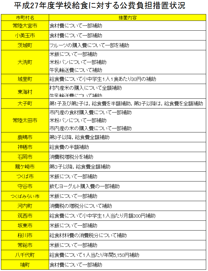 茨城県内市町村の給食費助成