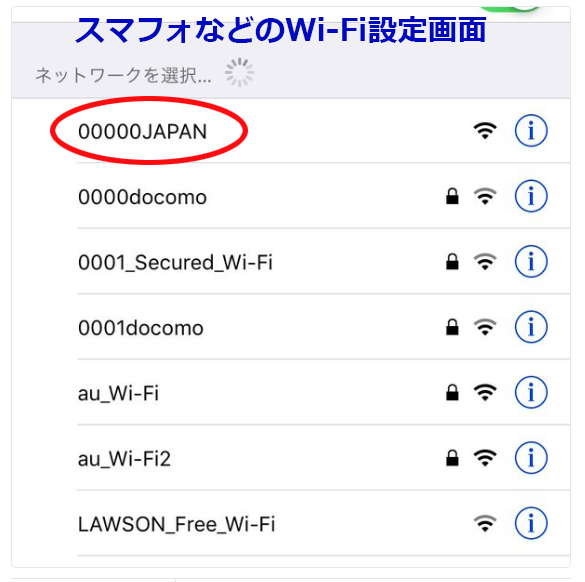 スマートフォンのWi−Fi設定でSSIDを「00000JAPAN」 を選択すれば利用できます。携帯電話事業者のWi−Fiサービスを契約していない人でも利用できます。