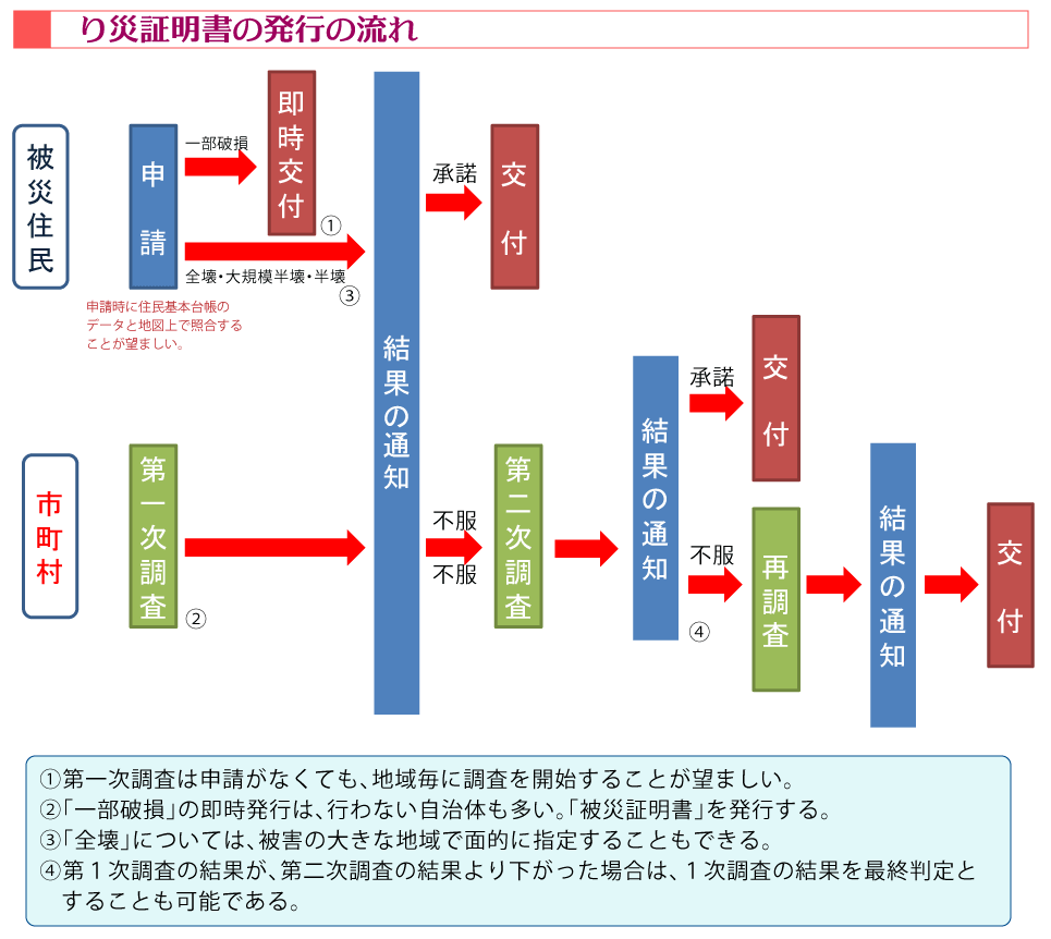 り災証明書の交付のためには、り災証明書の申請、被災した住宅を外見から調査する第一次調査、住人に立会いを求め住宅の内部の被害状況も調査する第二次調査、その結果をり災証明書で被災した住民に伝えるという手順になります。