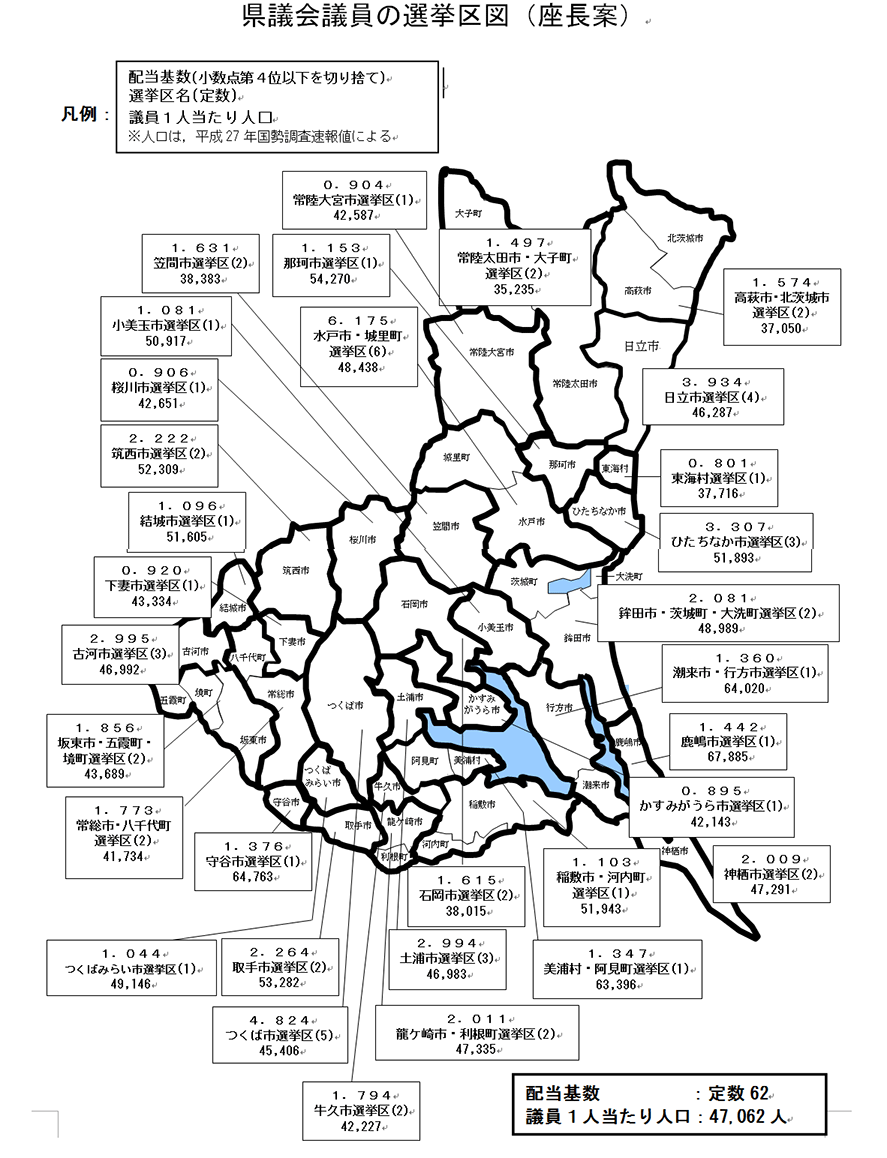 このほか、1票の格差是正、1人区を減らすなどの目的で、定数はそのままで高萩市区と北茨城市区、坂東市区と猿島郡区(猿島町+五霞町)をそれぞれ合区します。