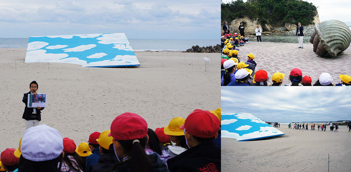 高萩市の小学1〜4年生の200人が、県北芸術祭の高戸海岸の作品を校外学習で訪れました。県北芸術祭実行委員会のジェネラルマネージョー・桑原康介さんが、1年生にも分かりやすいように、紙芝居形式の資料をつかって説明。子どもたちの感性の鋭さに、桑原さんも驚いていました。