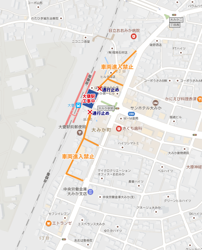 1月23日から、JR大甕駅舎の改築と自由通路の新設工事に伴い、大甕駅前の市道の通行ができなくなりました。今後、駅前広場も一時縮小するため、バスやタクシー、一般車の乗降場所が変わります。