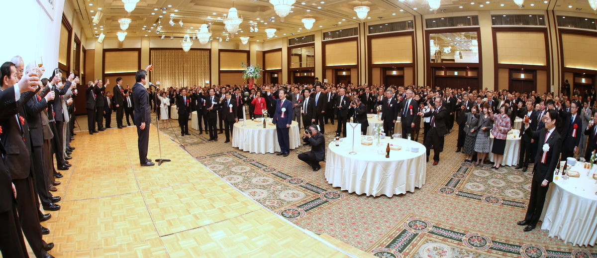 橋本知事、梶山自民党県連会長、藤島県議会議長、加倉井農政連会長、水戸市長ら県内各界各層の650名が出席