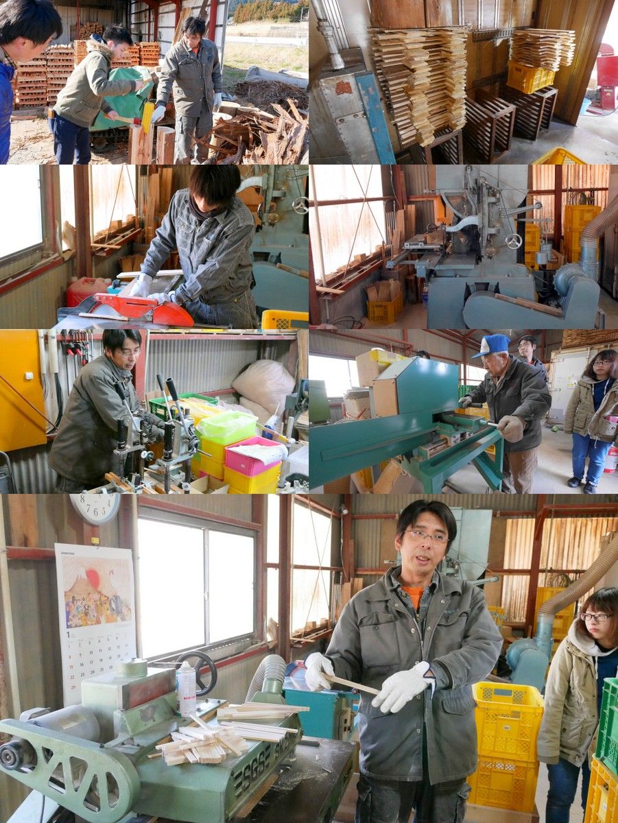 磐城高箸の割り箸作りは、杉の丸太を仕入れることから始まります。丸太をチェーンソーで切断し、斧で割り、乾燥させ、板に加工。その板を箸に加工し、仕上げを行い、焼き印を押し、袋詰めや箱詰めを行う。この過程を全て自社工場で完結しています。