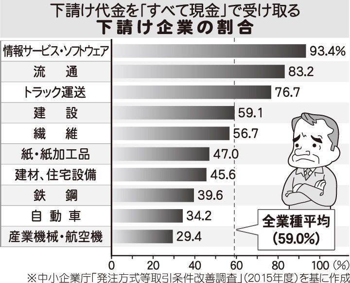 手形払いは、資金繰りが苦しい下請け企業にとって大きな悩みの一つです。現金化するには数カ月先の支払期日まで待たねばならないからです。期日前の現金化も可能ですが、銀行から手数料を取られ、額面通りの金額は受け取れなくなります。昨年1月に行った中小企業庁の委託調査では、下請け代金の受け取り方法が「すべて現金」と答えた下請け企業は全体の6割にとどまりました。業種間で差があり、産業機械・航空機や自動車などは4割にも満たない実態があります。