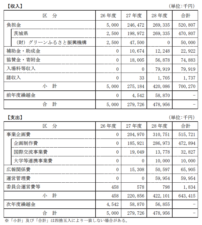 収入の主なものは、茨城県の負担金4億7080万円、グリーンふるさと振興機構の解散剰余金3000万円、国際交流基金アジアセンターからの助成金2292万円、入場料収入7991万円などとなっています。企業、団体、個人からの協賛金、寄附金が75件7488万円ありました。