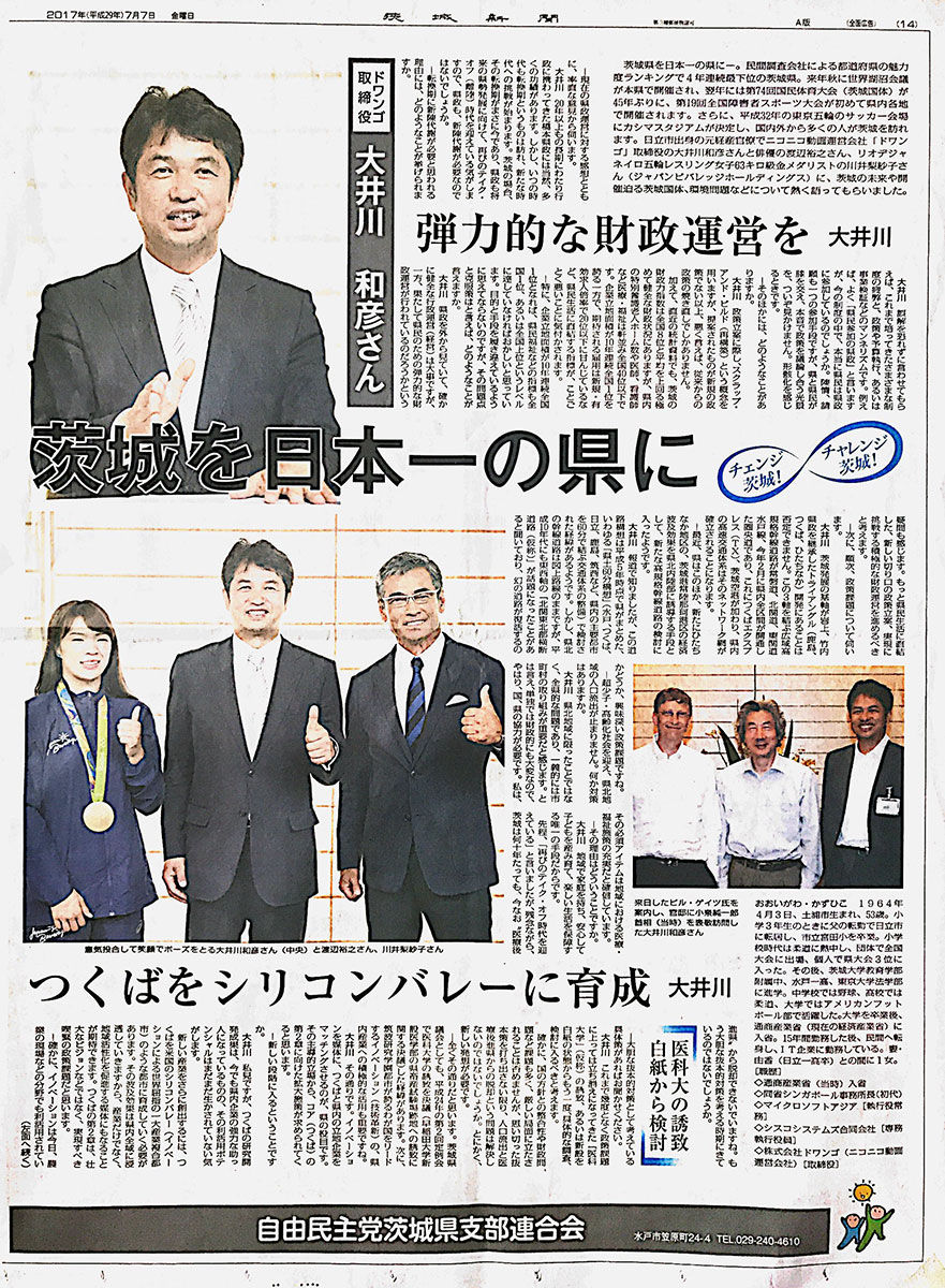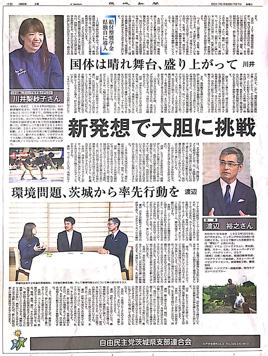 7月7日付け茨城新聞に、自民党茨城県連の見開き全面広告が掲載されました。8月27日に投票を迎える県知事選の自民党推薦予定候補・大井川和彦さんと俳優の渡辺裕之さん、女子レスリング金メダリストの川井梨紗子さんとの鼎談記事です。この中で大井川さんは、知事選に臨む自らの政策の一端を語っています。
