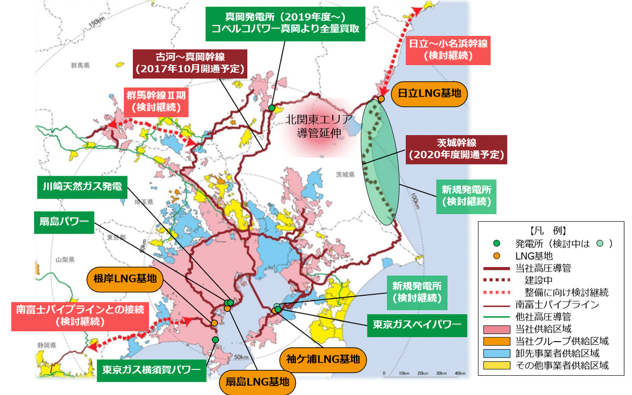 東京ガスは、2020年度には茨城幹線に加え、茨城港日立港区第5埠頭の日立LNG基地に2基目のタンク(23万キロリットル)を整備中です。茨城幹線の両端にそれぞれ火力発電所を新設する意向で、2基の建設に計約2千億円を投資する見込みです。設置場所について、東京ガスは「広大な敷地が必要で、具体的な場所はまだ決まっていない」と説明しています。