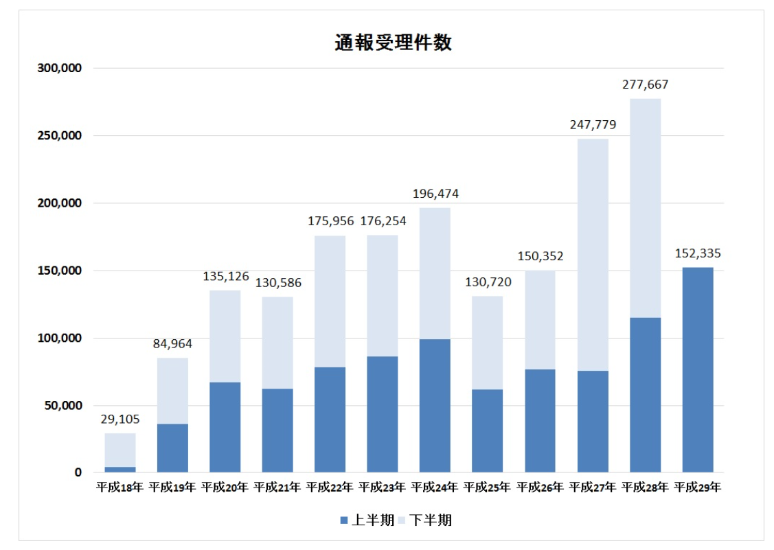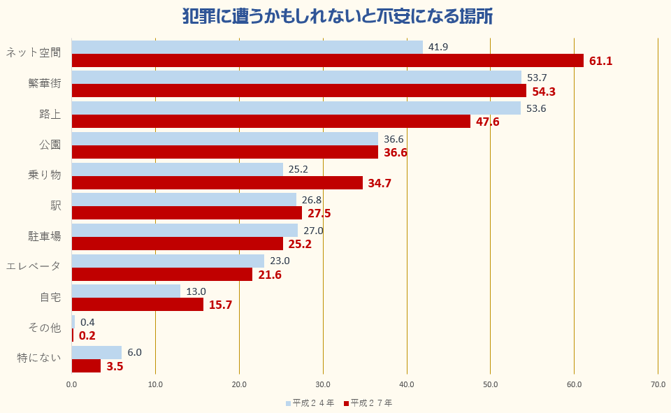内閣府が先月(2017年11月)公表した「治安に関する世論調査」では、「犯罪に遭うかもしれないと不安になる場所」を複数回答で聞いたところ、「インターネット空間」が61.1%で首位になりました。5年前の前回調査では「インターネット空間」は約42%で、「繁華街」「路上」の次でした。「インターネット空間」の約20ポイントもの上昇は、ネット犯罪への国民のいら立ちを表しています。