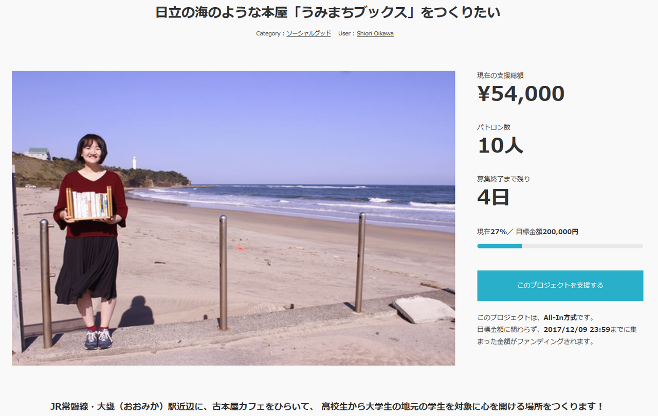 プロジェクトは目標20万円。目標金額に関わらず、12月9日までに集まった全額がファンディングされます。日立の海が大好きな女の子の夢に是非投資していただきたいと思います。