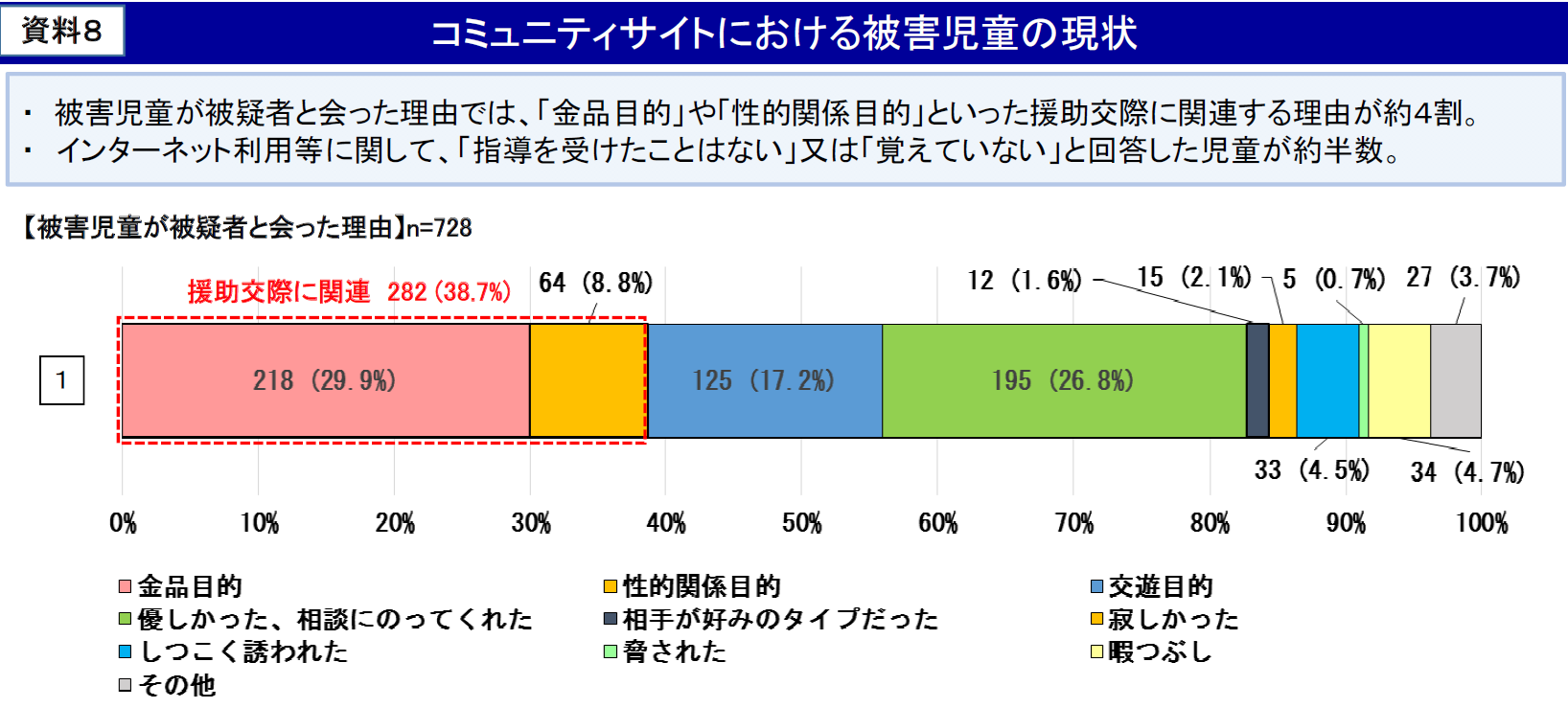 さらに、被害者が容疑者と直接会った理由を分析したところ、金品目的の援助交際関連が38.7%と最も多かった一方で、「優しかった・相談にのってくれた」が26.8%と続きます【グラフ参照】。相手の相談にのるふりをして言葉巧みに近づき、犯罪に巻き込んでいるとみられます。