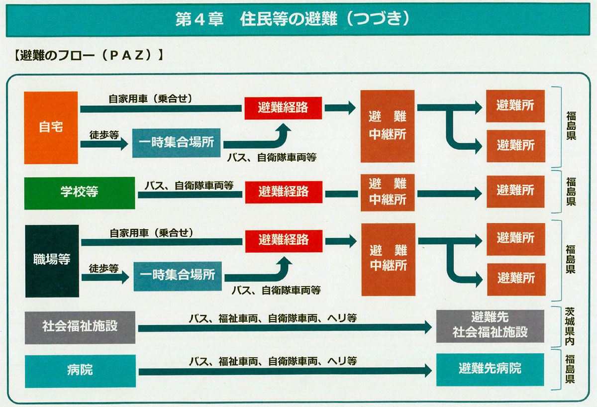 小学校区単位の地区ごとに福島県内17市町村の避難先が割り振りました。住民は設定された4つのルートから、最初に福島県内の避難中継所を目指します。中継所では、福島県の各市町村内の避難所を指定することになります。