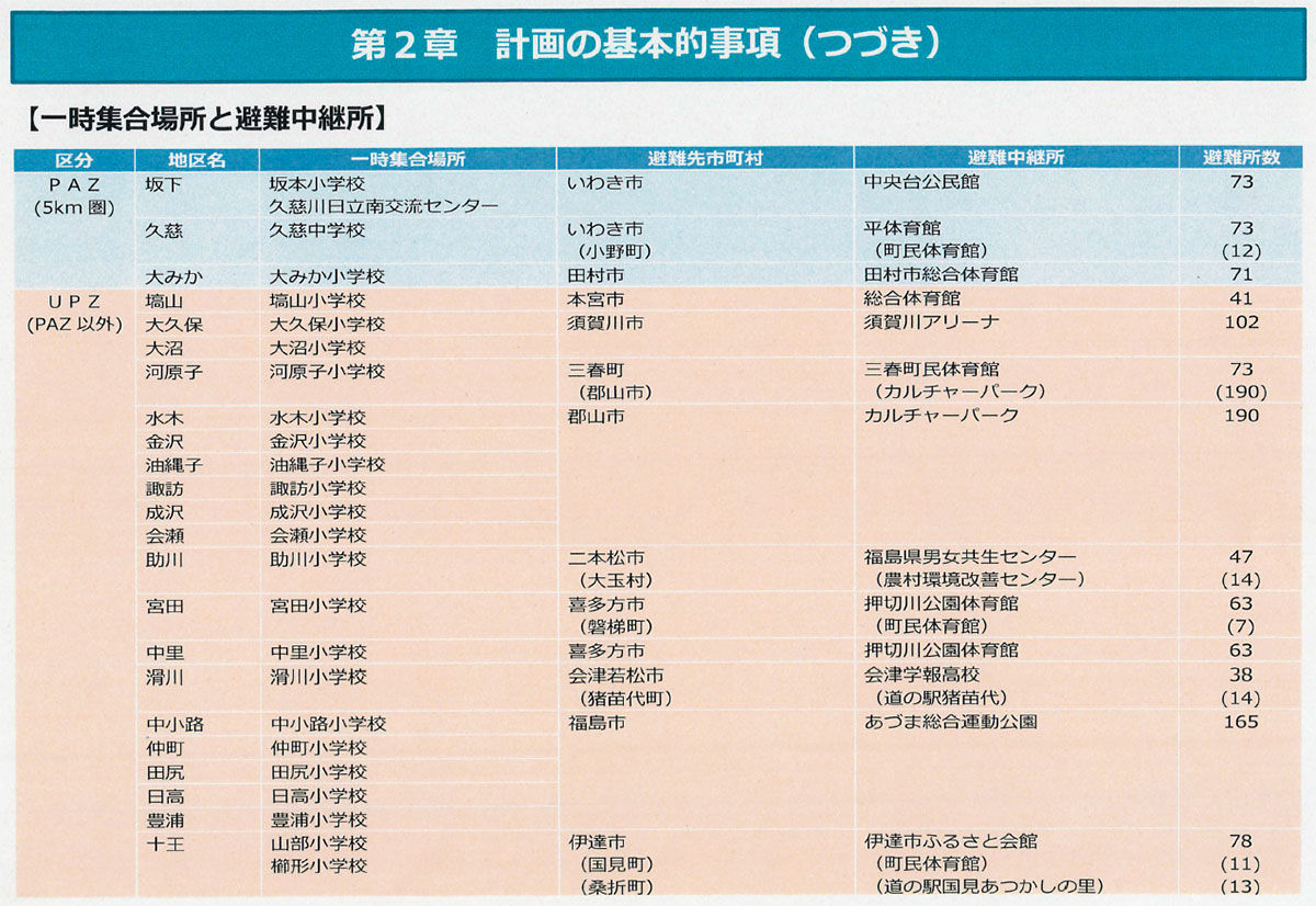 素案では、8月に福島県内17市町村と締結した避難協定を踏まえ、小学校区単位に設けられた全23地区ごとに避難する市町村が割り当てられ、避難先で実際の避難所の指定を受ける避難中継所を明記しています。
