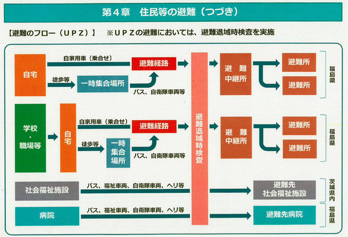 避難は原則マイカーを利用します。国道6号などの幹線道路から常磐自動車道に入るか、県道で常陸太田市方面に向かい、国道349号を北進して東北自動車道を使うかして福島県内に避難します。学区ごとに4つのルート(日立中央ICから常磐道、日立北ICから常磐道、高萩インターから常磐道、国道349経由で東北道)が設定されました。