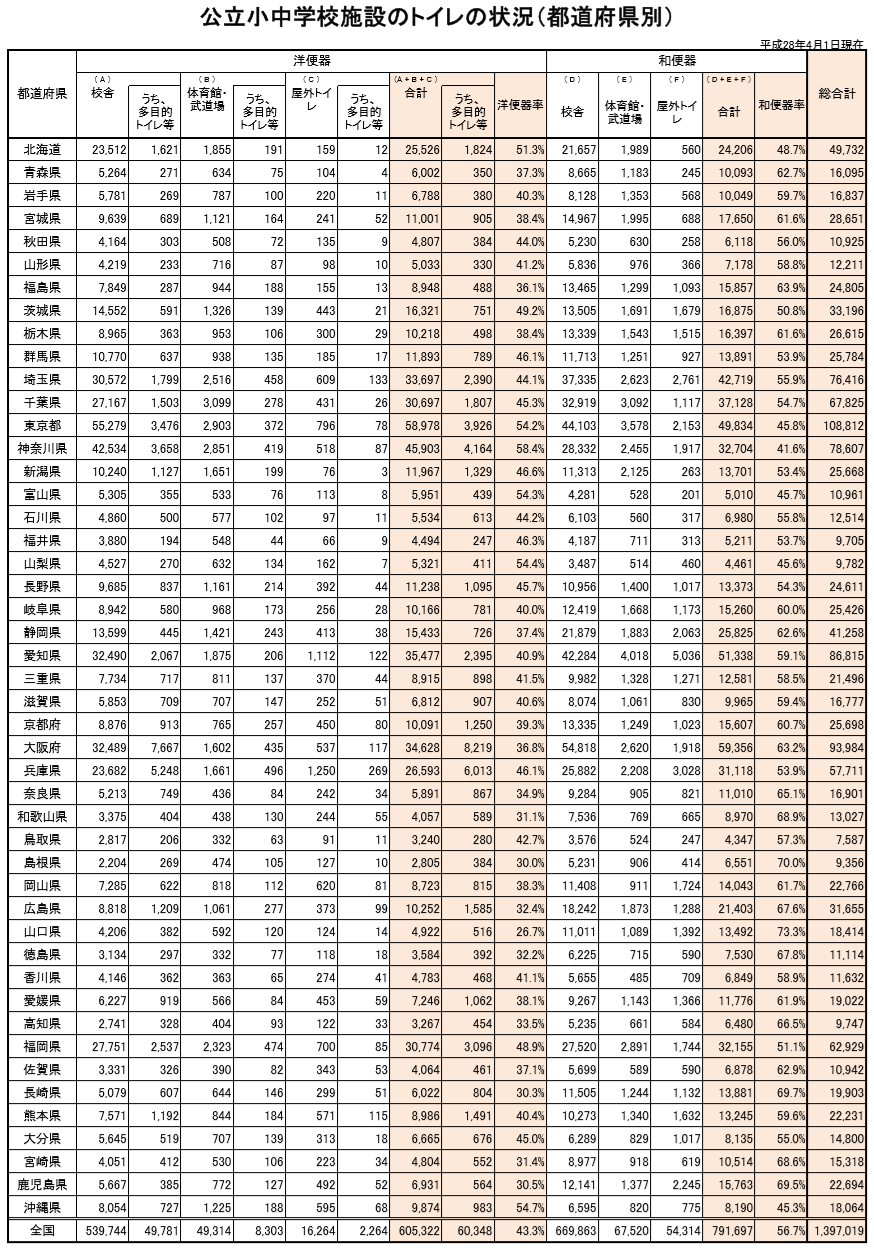 文部科学省が2017年11月に発表した調査結果によると、全国の公立小中学校にあるトイレの便器は約140万基あり、そのうち洋式便器は約61万基で、全体の43.3%にとどまっています。都道府県別で見ると、便器の洋式化率が高い順に神奈川(58.4%)、沖縄(54.7%)、山梨(54.4%)と続きます。政令市別では横浜市が72.6%で群を抜いています。