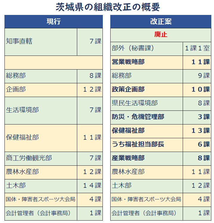 改組の理由:「新しい茨城」づくりに向けた政策立案、総合計画、地方創生総合戦略等の推進に係る一体的な推進体制を整備するため、企画部を「政策企画部」に改組する。