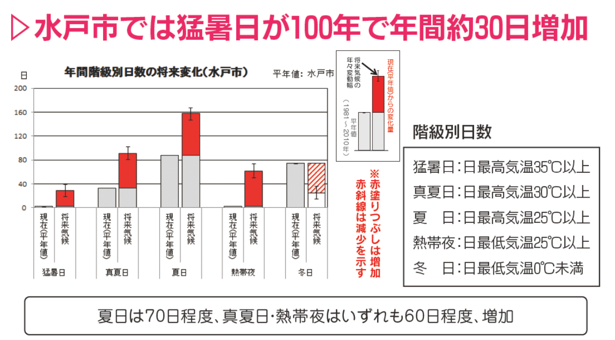水戸市では、年間で猛暑日が30日、25度以上の夏日が70日それぞれ増加。30度以上の真夏日と熱帯夜もそれぞれ60日増えるとの結果となりました。