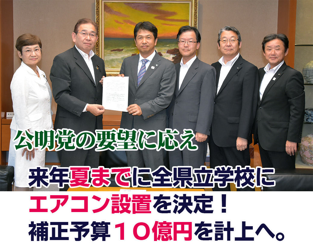 先月(7月)27日、県議会公明党は大井川和彦知事に、酷暑対策を求める緊急要望を行いました。全ての小中高等学校の普通・特別教室への空調機器設置を求めたほか、県立学校のエアコン整備が従来保護者の負担で設置されており、県予算による整備を強く求めました。