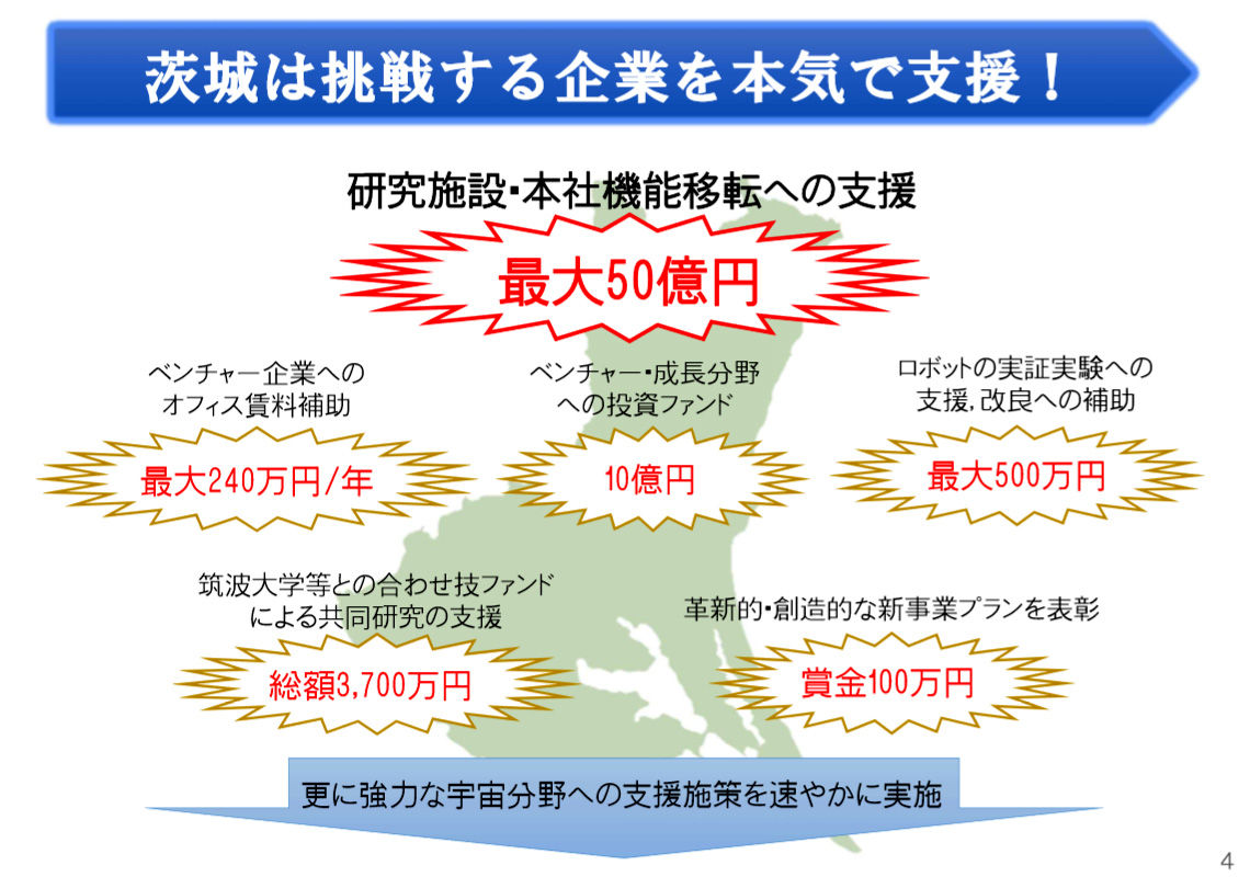 8月27日茨城県の大井川和彦知事は、宇宙ベンチャーの創出・誘致と県内企業の新規参入を目指し、「いばらき宇宙ビジネス創造拠点プロジェクト」に乗り出すと、東京都内で記者会見し発表しました。国や宇宙航空研究開発機構(JAXA)と連携し、ベンチャーと投資家のマッチングの場づくりや専門家による相談窓口の設置、手厚い資金援助などを行います。宇宙産業に特化した自治体のベンチャー支援は全国初の試みです。筑波研究学園都市が立地する本県の強みを生かし、「自動車産業を超える裾野の広い成長産業」と期待される宇宙ビジネスで、県内に関連企業の集積を目指します。
