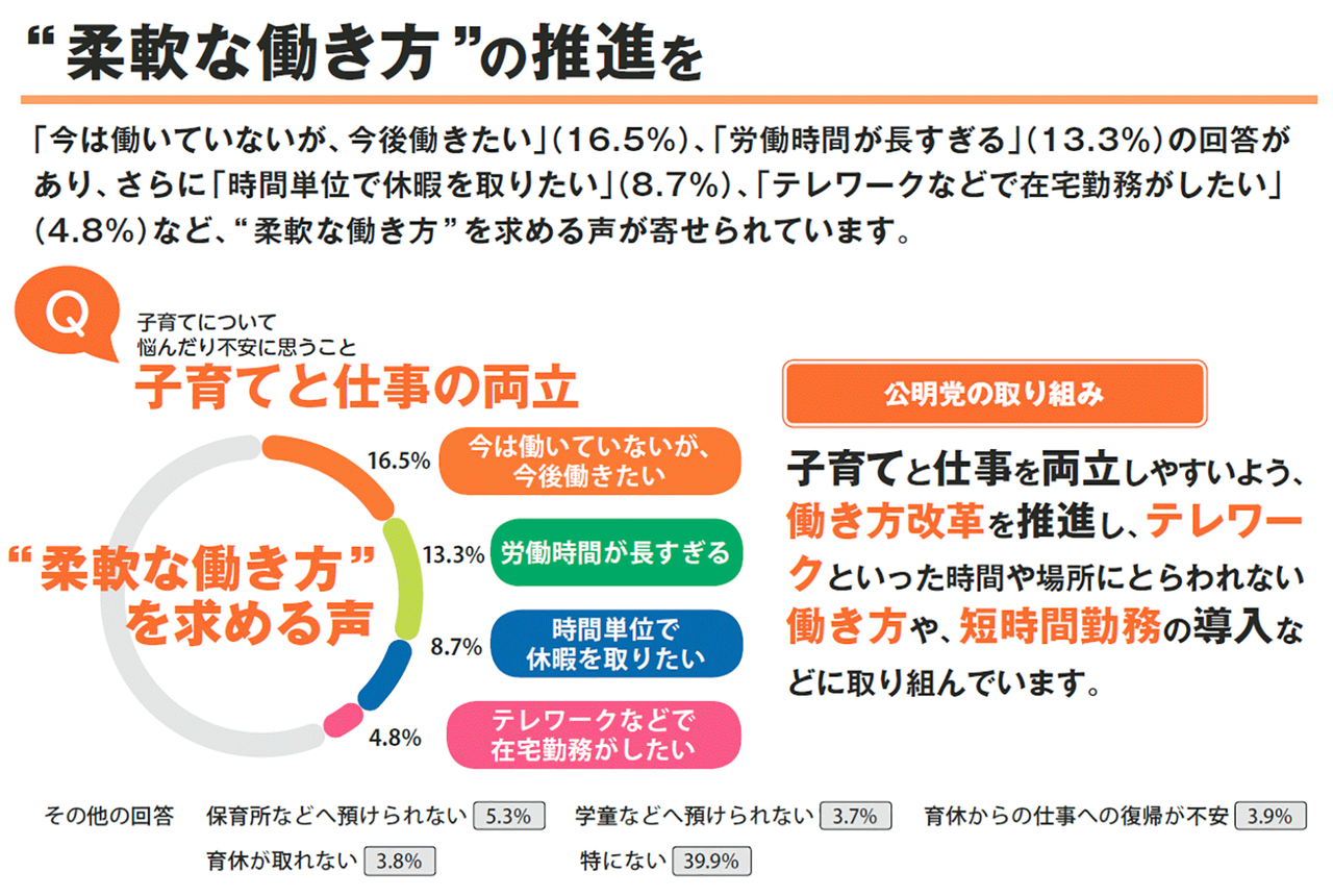 一方、子育てと仕事の両立に関しては「今は働いていないが、今後働きたい」が16.5%に上り、「労働時間が長すぎる」(13.3%)、「時間単位で休暇を取りたい」(8.7%)といった声も上がりました。子育てしながら安心して働ける“柔軟な働き方”実現への要望の大きさが浮き彫りになりました。