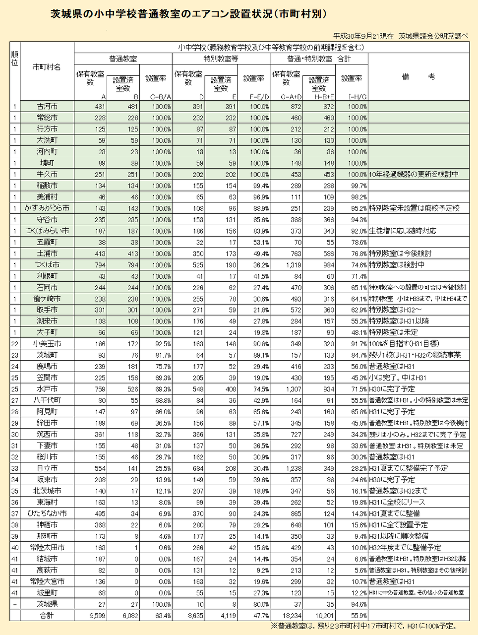 茨城県においては、国に先立って7月下旬に茨城県知事をはじめ、市町村長に小中高等学校、幼稚園の普通教室にエアコンを設置するよう申し入れを行いました。その結果、県内すべての市町村は平成32年度中のエアコン設置を決め、9月議会に補正予算などを計上しました。国の新たな財政支援策が決まった以上は、32年度まで整備に時間がかかるとしている北茨城市、常陸太田市、筑西市に関しても来年夏までのエアコン設置を働き掛けてまいります。