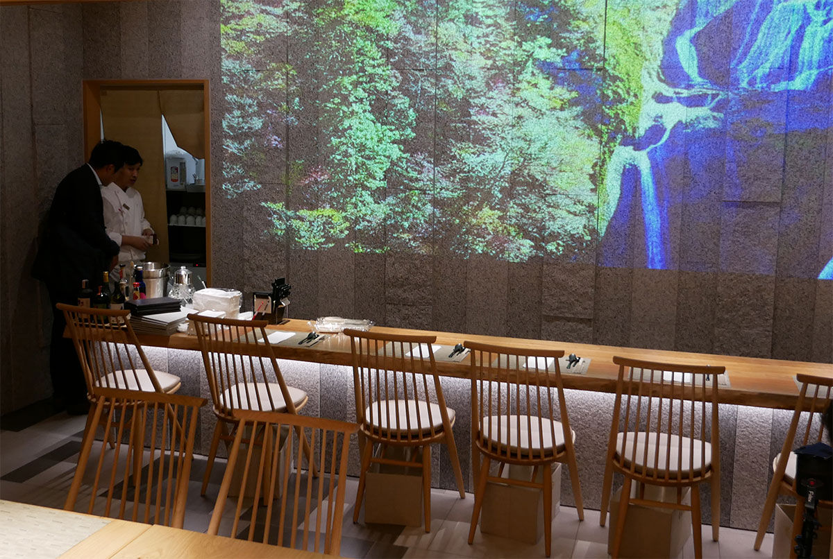 ダイニング(BARAdining)は25席で、壁には稲田石を設置。プロジェクションマッピングで袋田の滝の映像を楽しみながら、常陸牛やアンコウなど県産高級食材を使ったランチやディナー、地酒を味わえます。