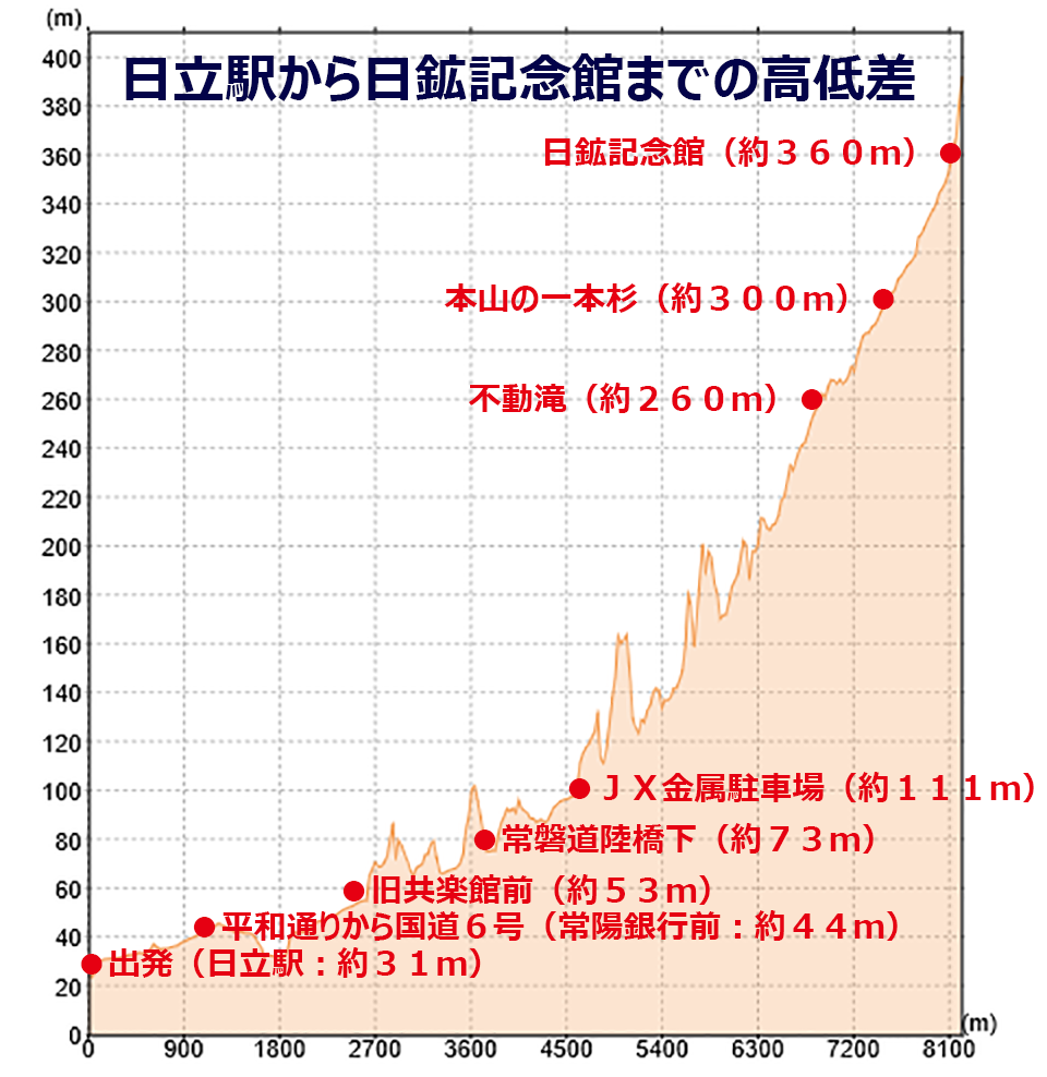 目指すは、日鉱記念館。往復18.2km、高低差が330mあります。