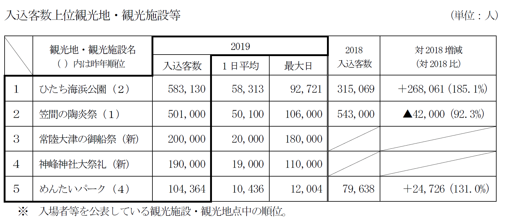 また、5年に1度実施の北茨城市の「常陸大津の御船祭」は20万人、7年に1度の日立市の「神峰神社大祭礼」には19万人が訪れ、観光客数を大幅に押し上げました。