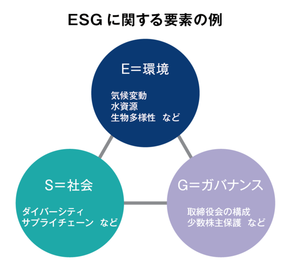 環境問題の解決や社会貢献、労働環境の改善などに積極的に取り組む企業に投資するESG投資が世界的な潮流となっています。わが国経済の持続的な成長にとって重要な動きであり、日本企業がESG投資を呼び込めるよう国が後押しする必要があります。ESGは環境(Environment)、社会(Social)、ガバナンス(Gvernance)の英語の頭文字を合わせた言葉です。投資するために企業の価値を測る材料として、これまではキャッシュフローや利益率などの定量的な財務情報が主に使われてきました。それに加え、非財務情報であるESG要素を考慮する投資を「ESG投資」といいます。ESGに関する要素はさまざまですが、例えば「E」は地球温暖化対策、「S」は女性従業員の活躍、「G」は取締役の構成などが挙げられます。