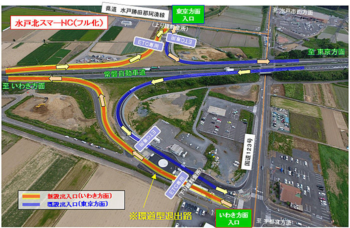 フルIC化に向けた工事は2017年6月に着手されました。本線に直結する取り付け道路は上り線出入り口が県道に、下り線出入り口が国道123号にそれぞれ接続されます。各取り付け道路には、誤って進入した際の迂回路も設けられました。総事業費は18億4000万円で、うち水戸市の負担は1億3000万円です。