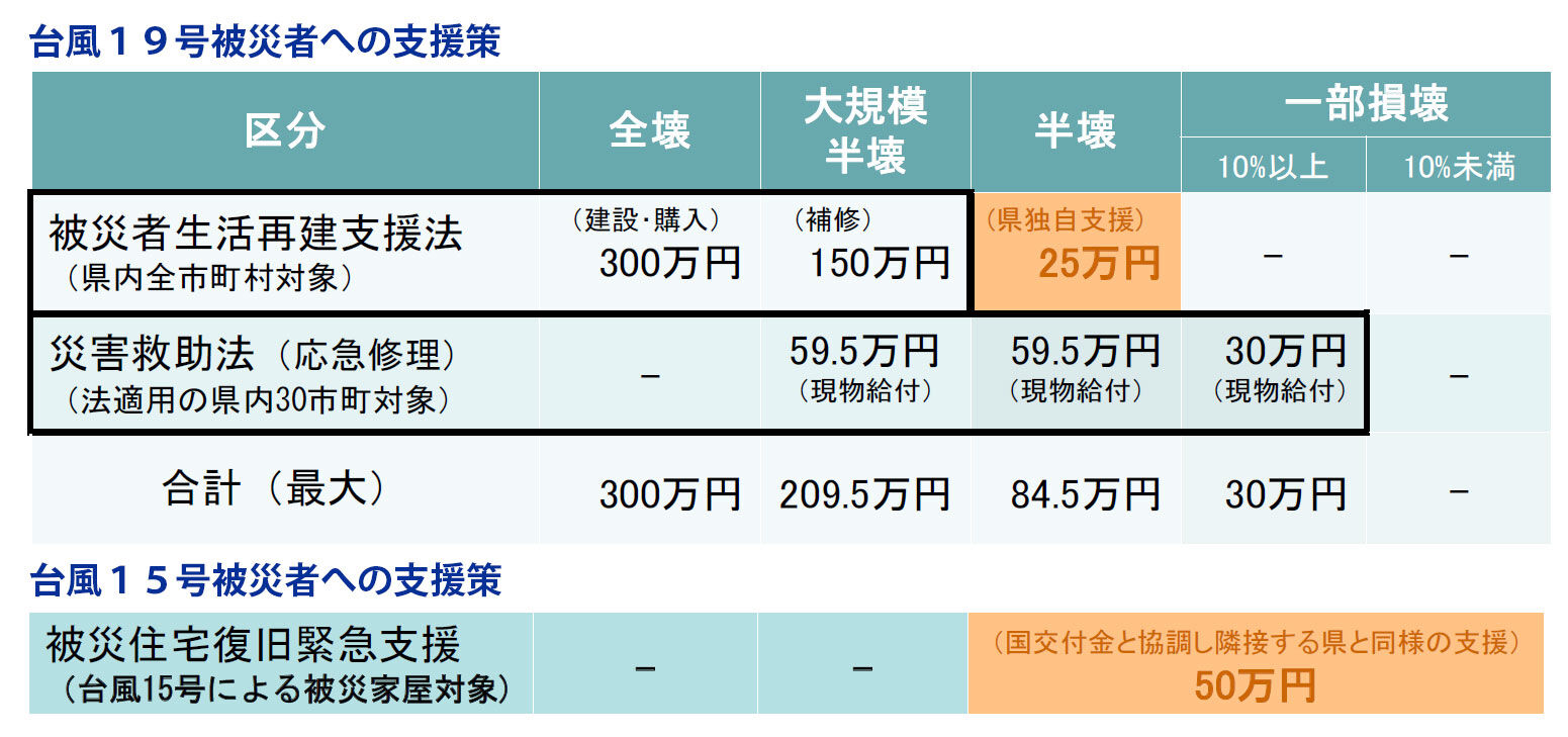また、台風15号に限っては、国土交通省の防災・安全交付金に基づき被災住宅復旧緊急支援として屋根修理費などに使える30万円とともに、県独自に20万円を上乗せし最大50万円の支援金となります。茨城県は台風15号に関しては災害救助法の対象となっていないため、国交省の補助事業のメニューを採用しました。